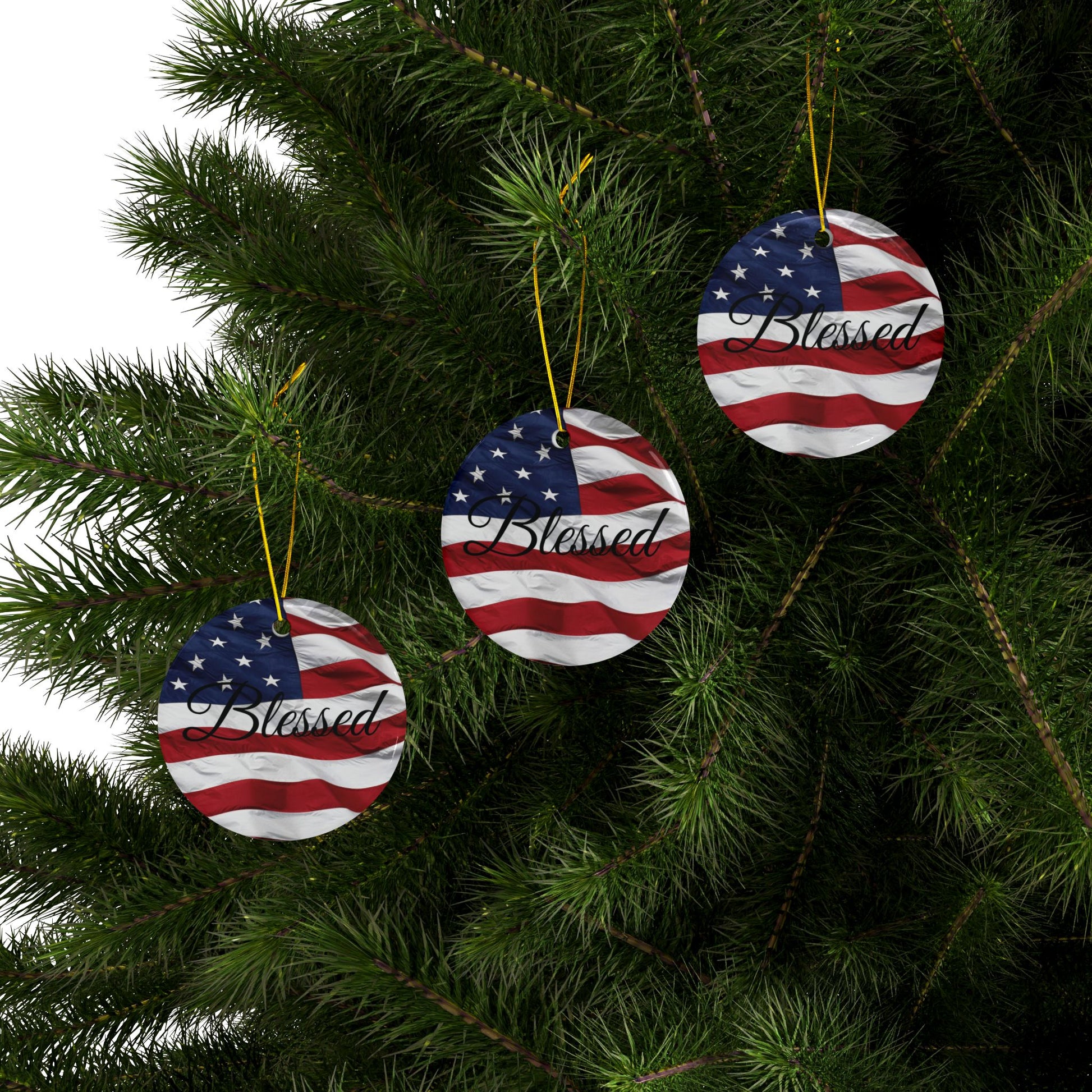 Ceramic Ornaments - Patriotic - Blessed Print - American Flag Backdrop - Red White & Blue