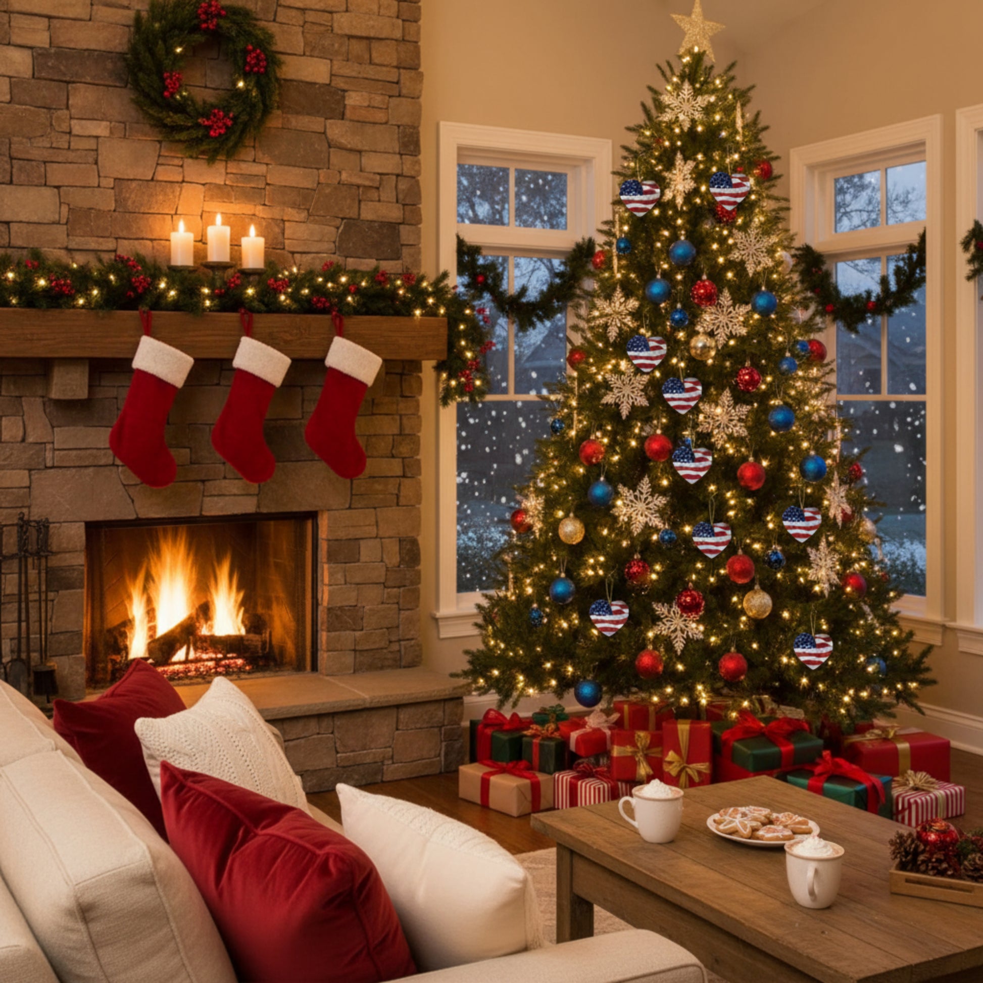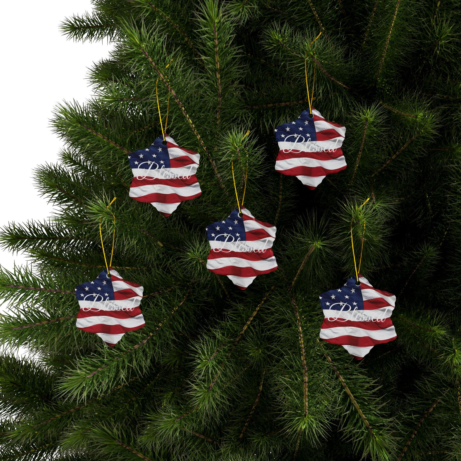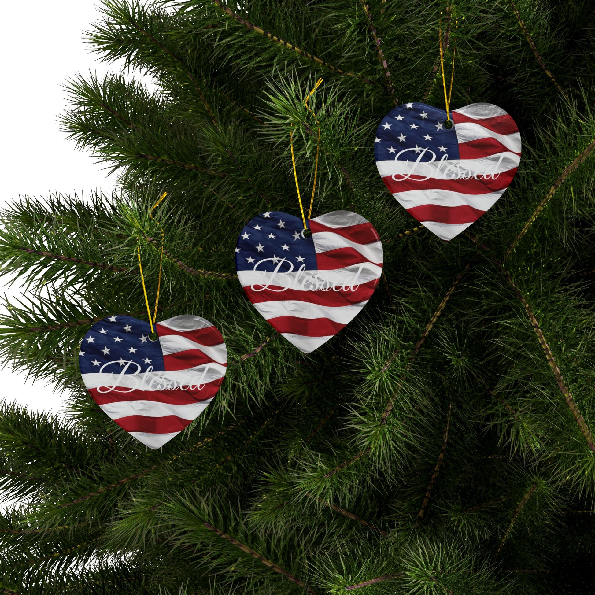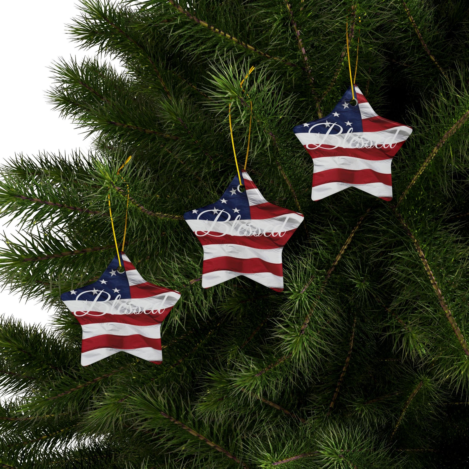 Ceramic Ornaments - White Blessed Print - American Flag Backdrop - Red White & Blue Design (1-10pcs)