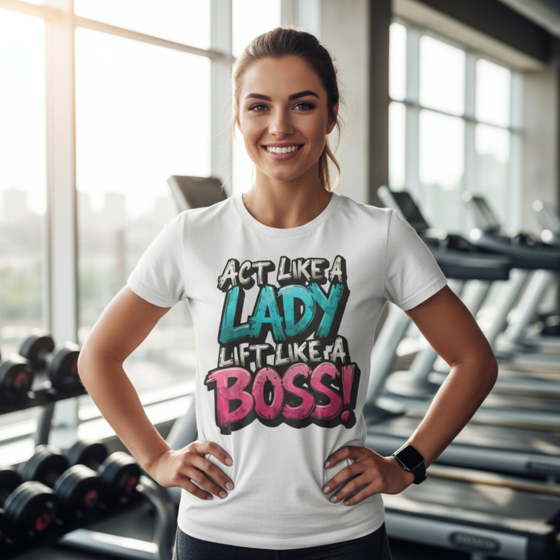 - Bold "Act Like a Lady, Lift Like a Boss" graphic