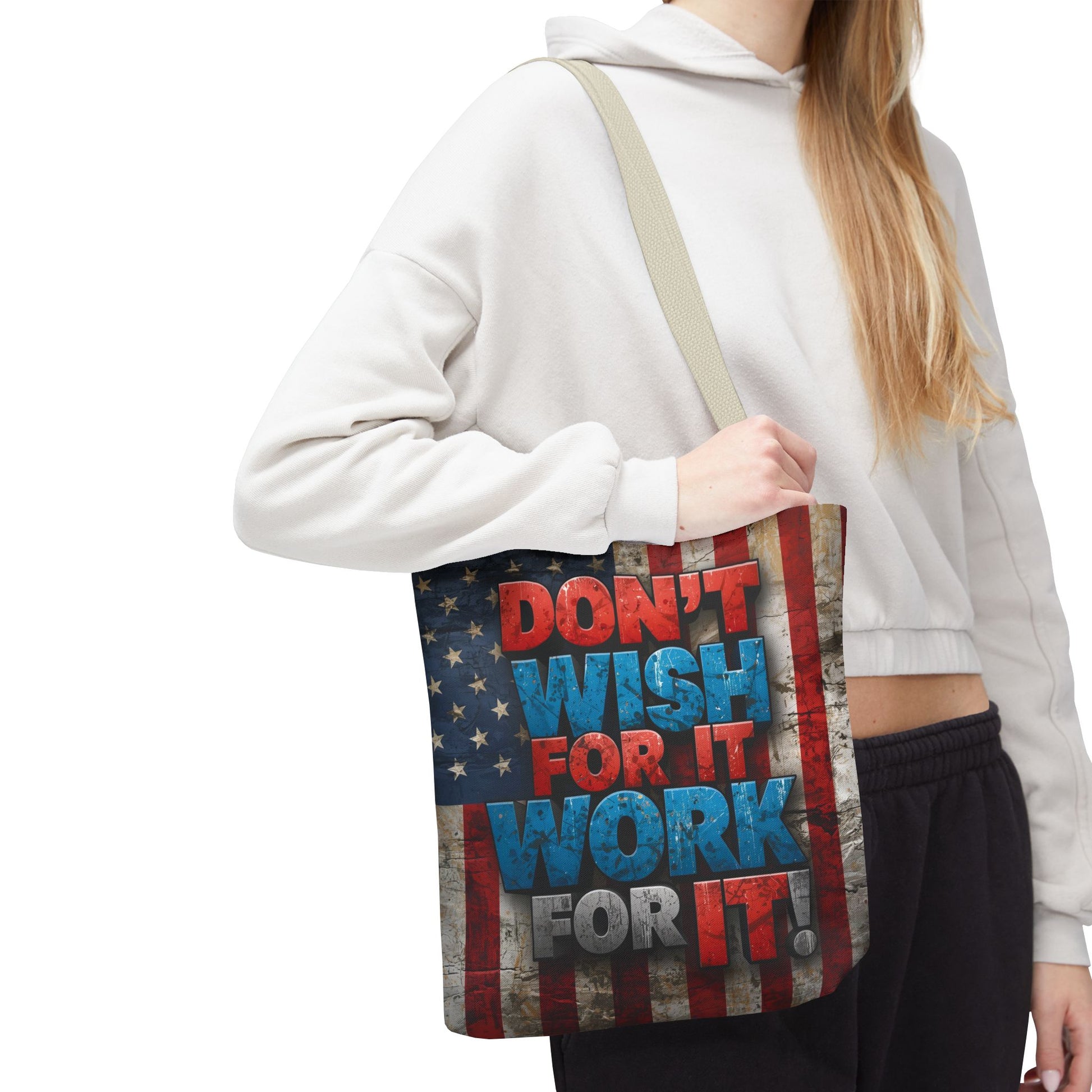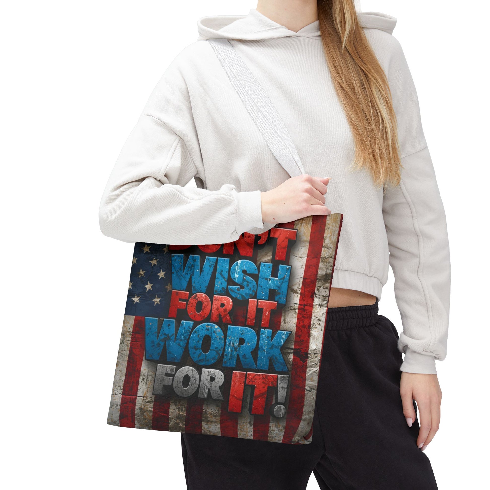Motivational Tote Bag - Vintage American Flag Design - Don't Wish For It Work For It! - Gym - Grocery - Travel - Gifts - Everyday Carry