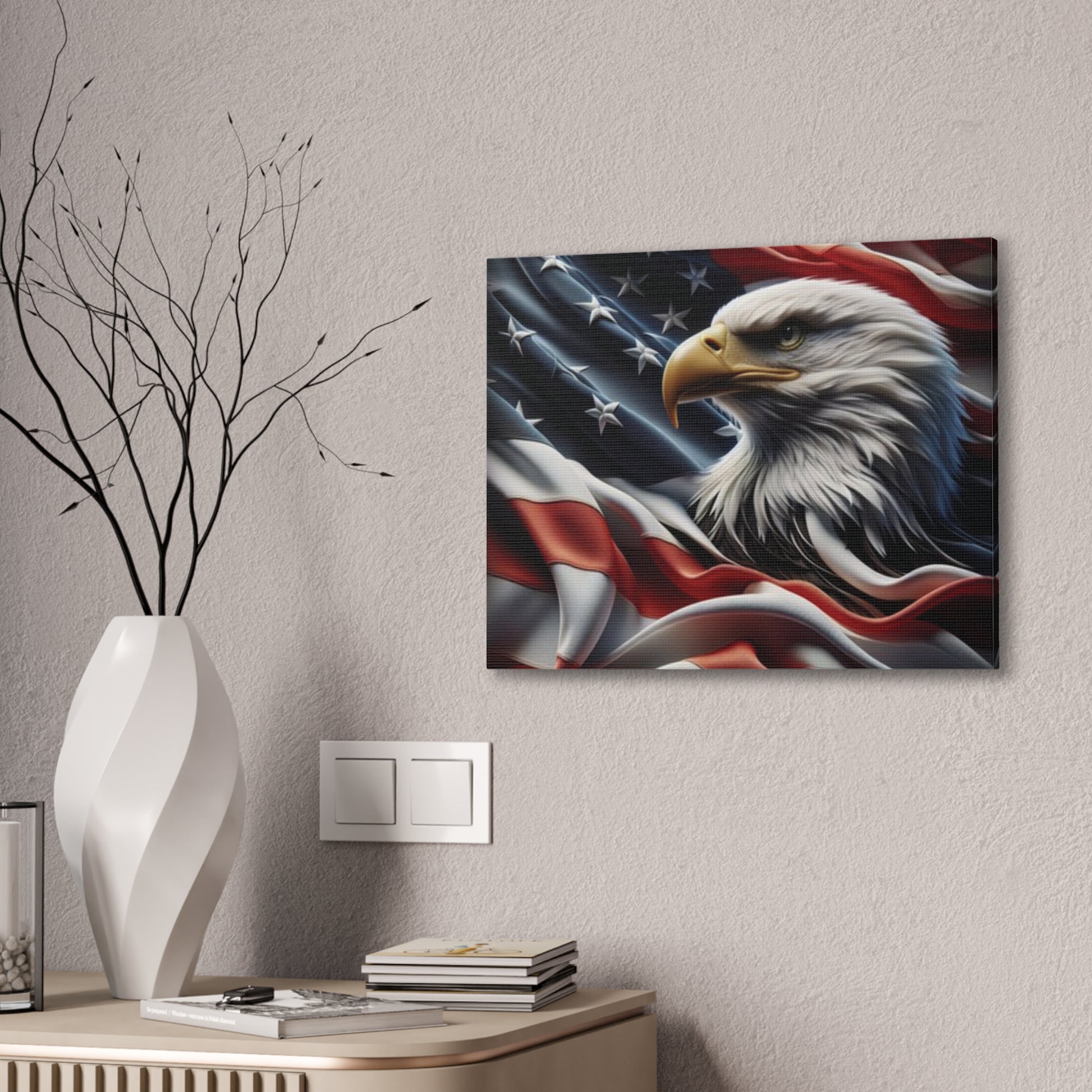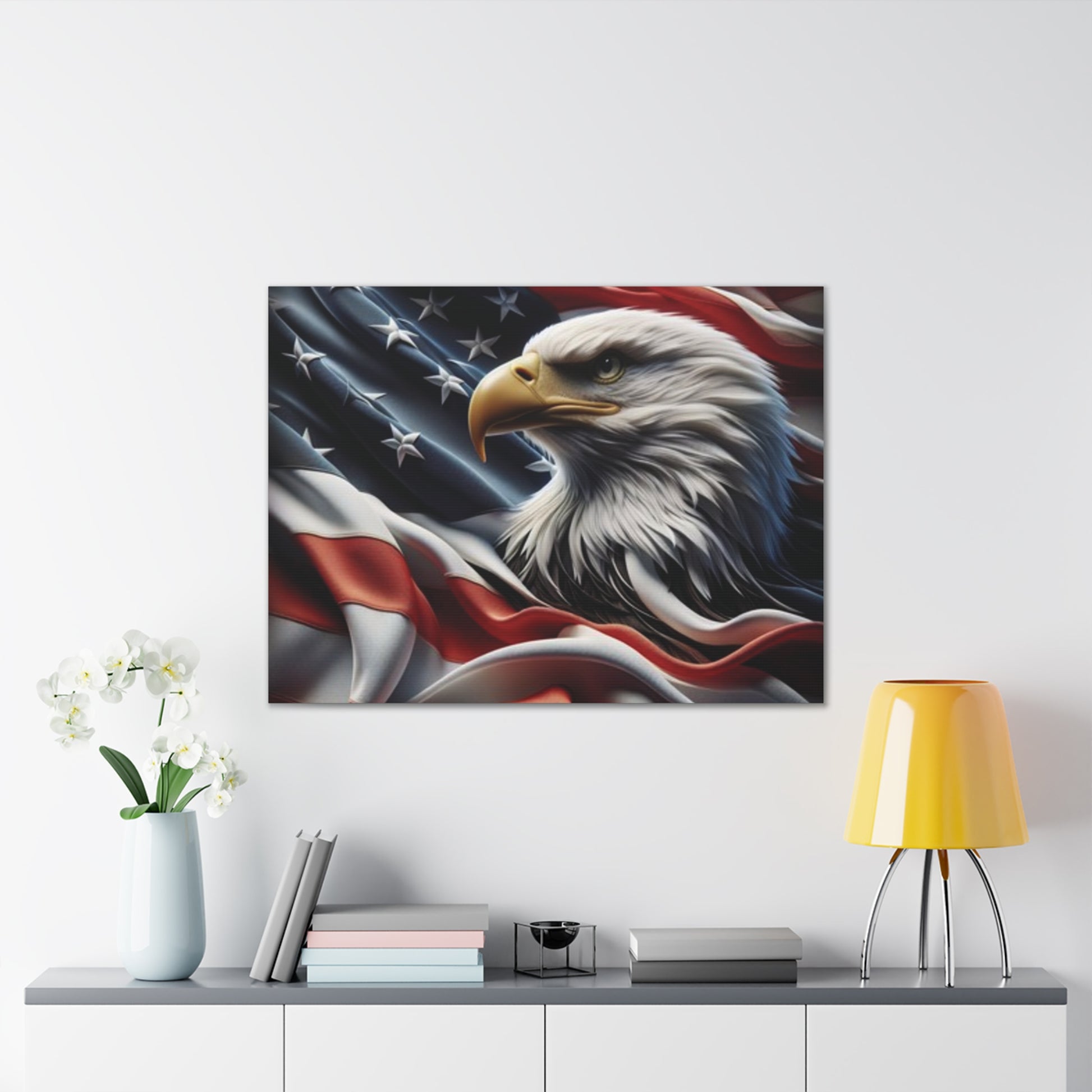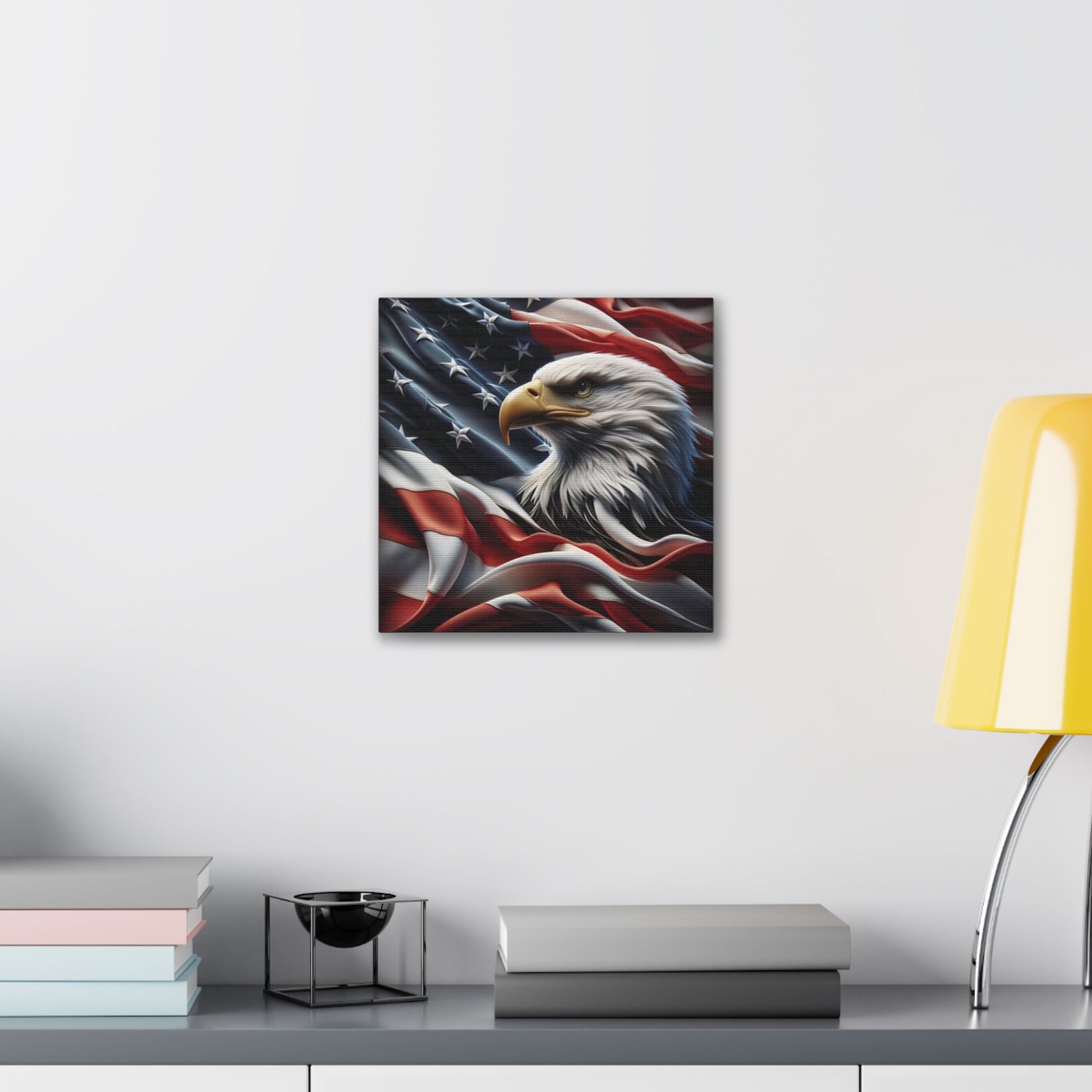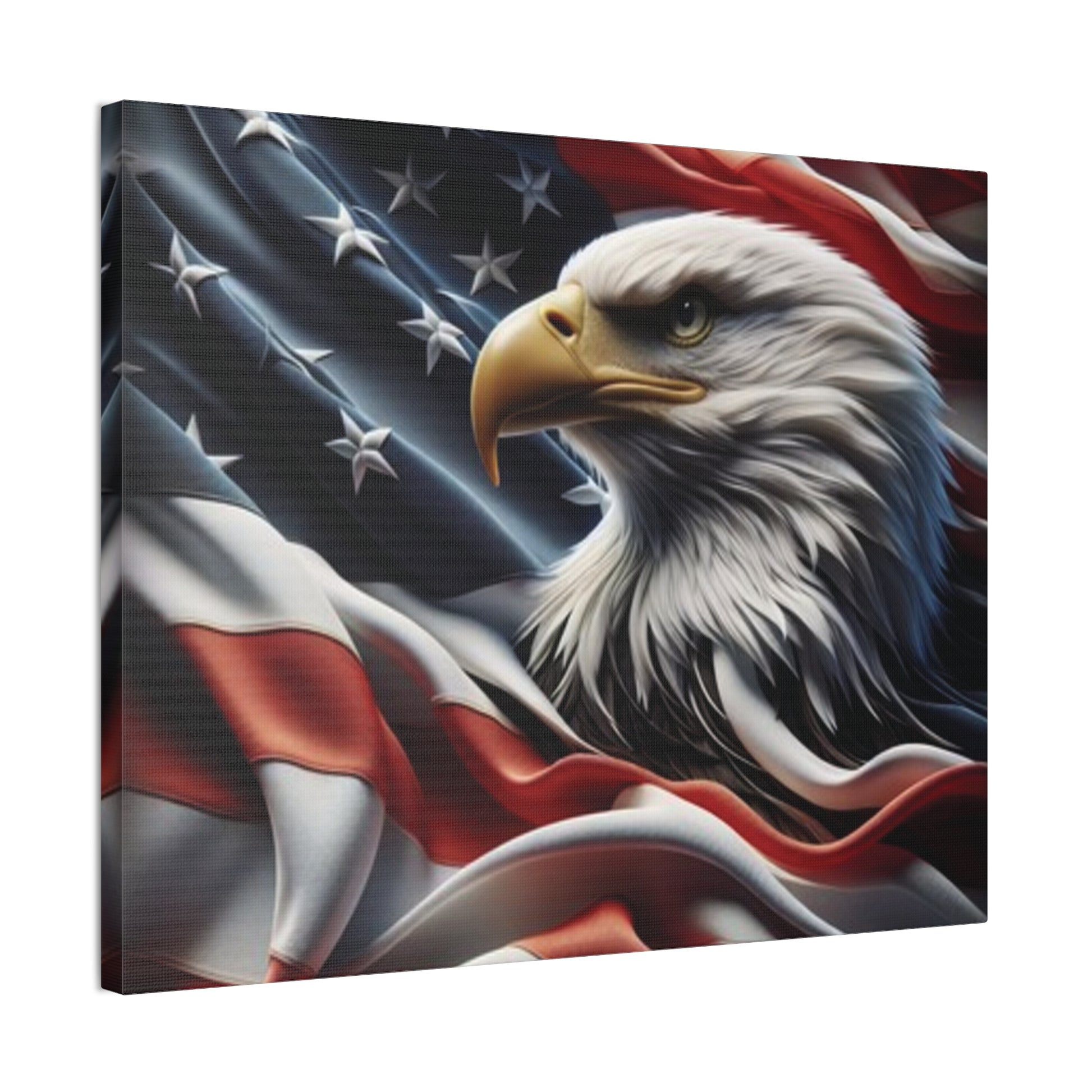 Transform your space with this stunning Canvas Print, beautifully capturing the majestic eagle against a backdrop of flowing American flags.