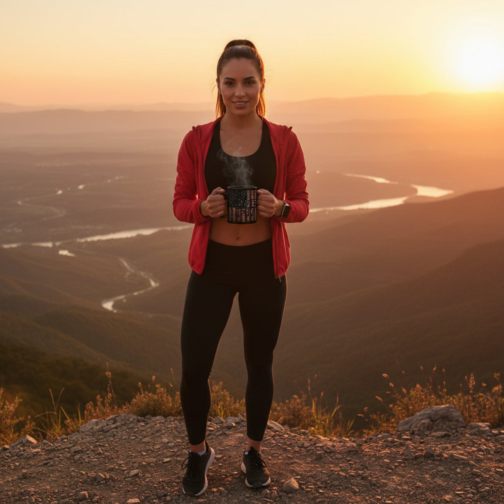 - Glossy black ceramic with vibrant LIVE FIT and vintage flag design